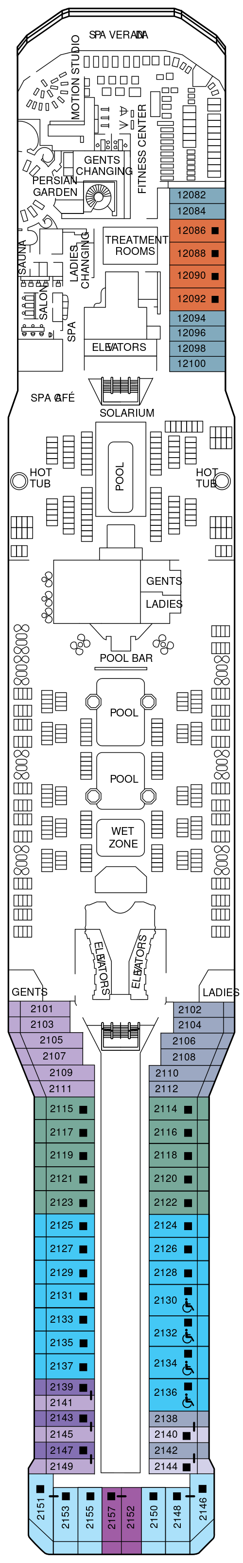 洋上では世界最大規模となるスパ施設をご用意。各種マッサージや鍼など、グレードの高いリラクゼーションをご提供します。温浴ルーム「ペルシャンガーデン」ではアロマの香りに包まれるミストサウナ、岩盤浴、ドライサウナをご用意しています。