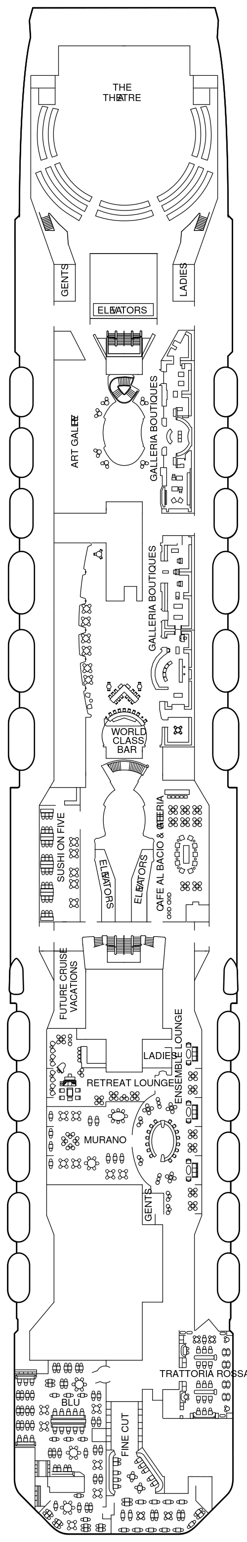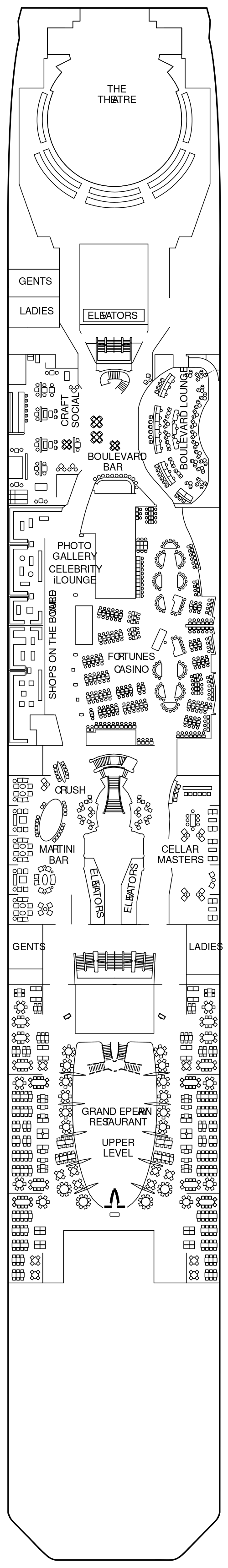 毎夜日替わりで本格的なショーが繰り広げられ、1度きりではなく毎夜足を運んで本格的なエンターテインメントをお楽しみいただけます。厳しいオーディションで選び抜かれたセレブリティクルーズ社のエンターテインメントのスタッフによる歌と踊りのプロダクションショーは圧巻です。